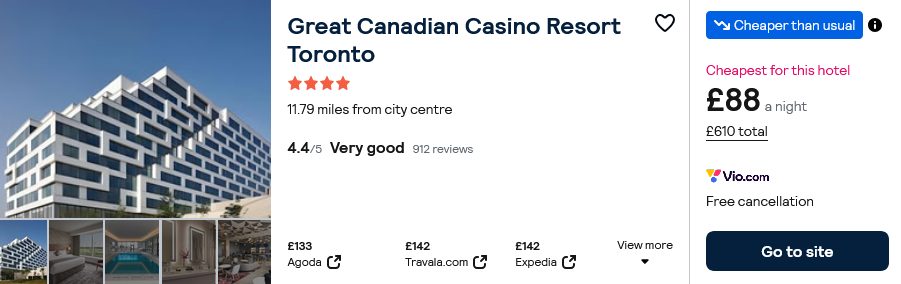 601 £/person (flight and accommodation Great Canadian Casino Resort )